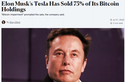 테슬라는 2분기 실적 보고서에 따르면 비트코인의 75%, 약 9억3600만 달러를 매도(매각)했다.